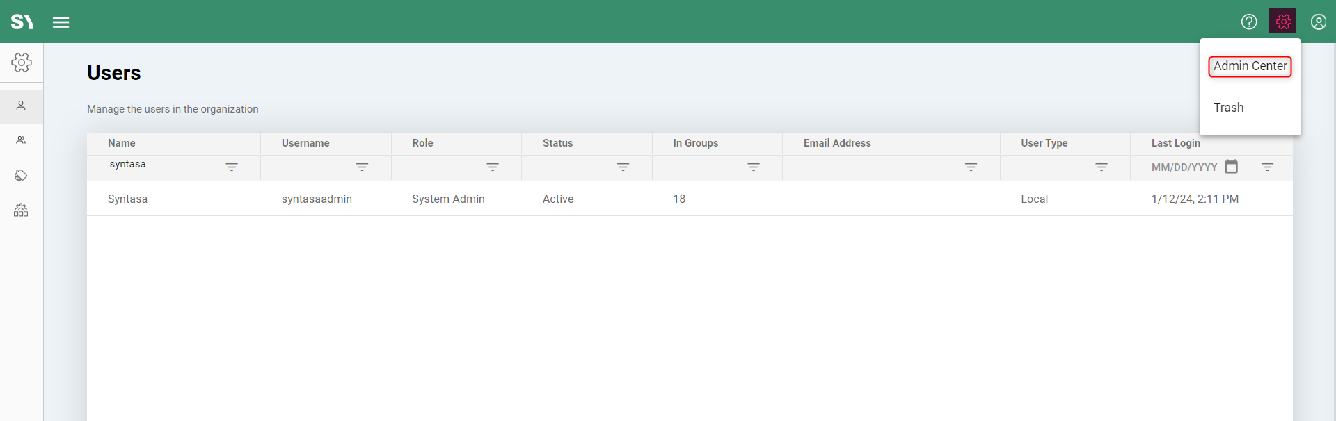The User Management screen is the default screen when entering the Admin Center menu (as seen above), but also can be navigated to by clicking on the user icon (