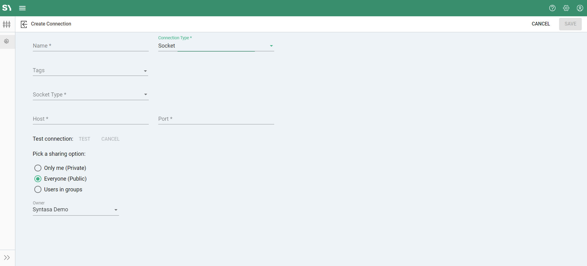 A communication link between two endpoints, enabling data exchange between applications over a network. After selecting 'Socket' as the Connection type, you will be presented with a set of below fields: