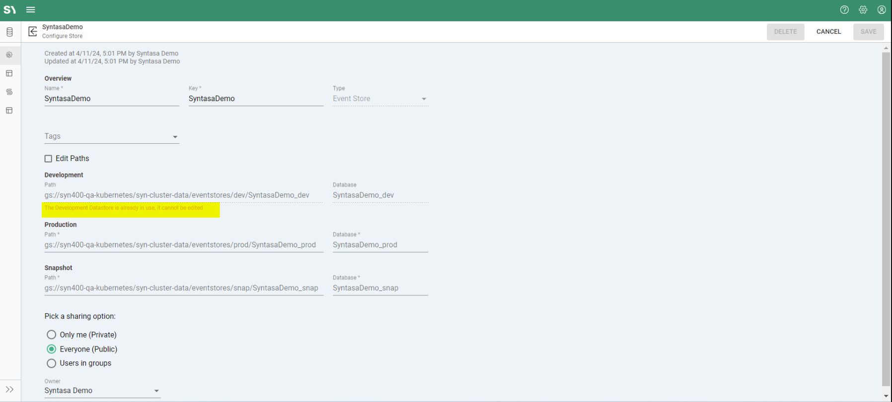 It is important to note that once an app has utilized an event store for development, production, or snapshot purposes, the corresponding path and database names are locked for editing. This restriction ensures data integrity and prevents inadvertent changes to critical configurations. To clarify it further,