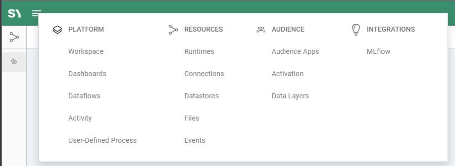 ) and selecting any of the menu or submenu items Under Section Resource Resources like Runtime, Connections, DataStores, Files, or Event.