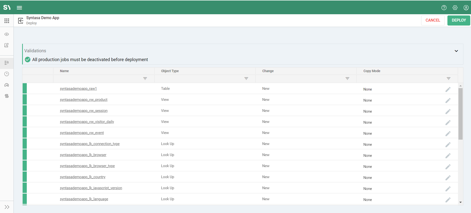 When you click the 'Deploy' button, a screen will display all the datasets ready for deployment to production. For the first deployment, no action is needed—just click 'Deploy' to start the process. After this initial deployment, you can edit the copy mode for each dataset. Let's review each column on this screen: