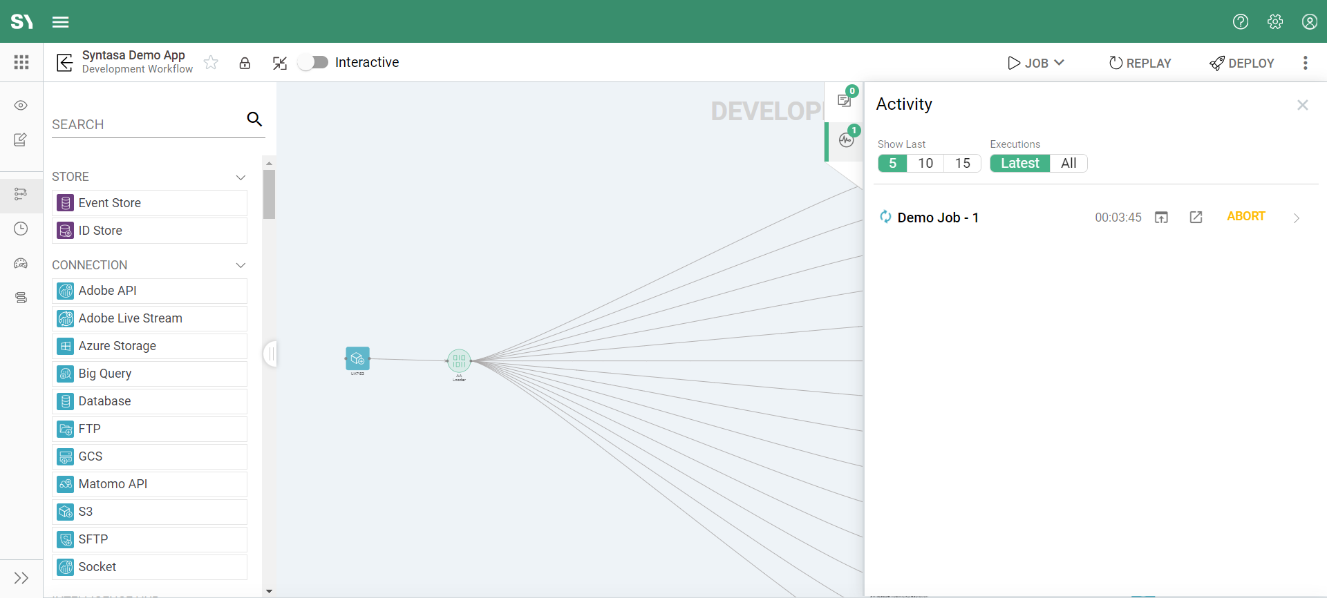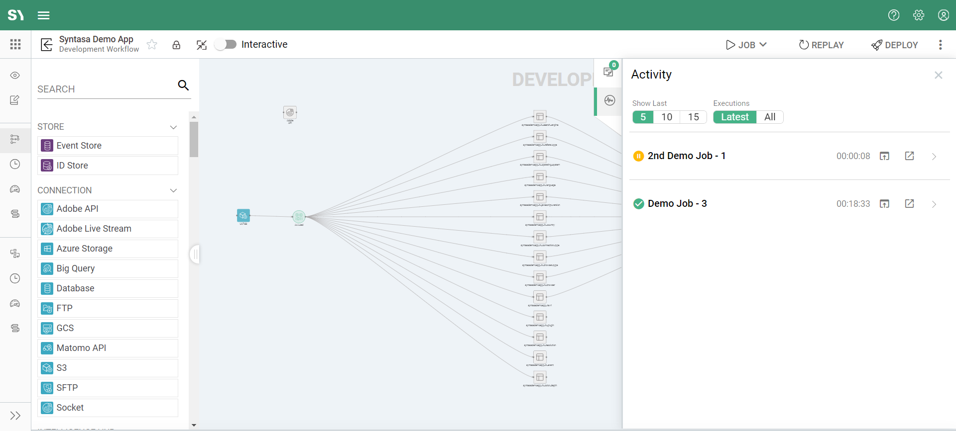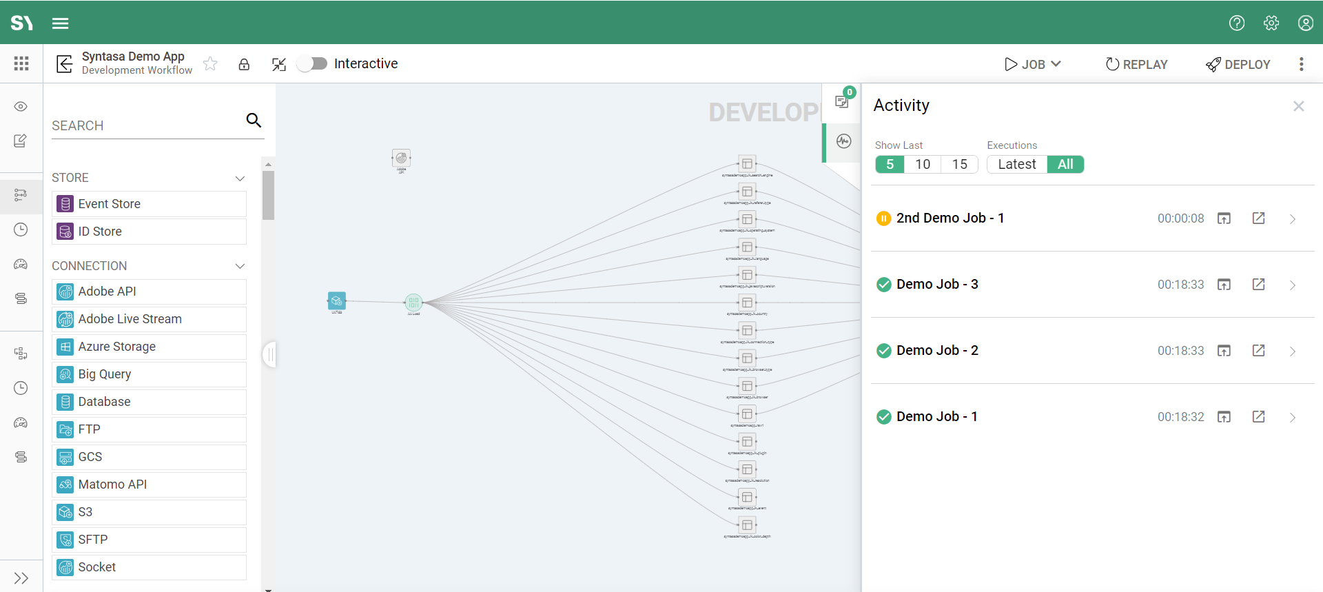 Click the 'Activity' icon shown on the left sidebar. Upon clicking 'Execute', you will see an 'Activity' screen as shown below. This screen shows the list of jobs that were executed or being executed. In the below example, it shows the job that we just triggered. As it is our first job, it is suffixed by '-1' and for the next job, it will be suffixed by '-2'.
