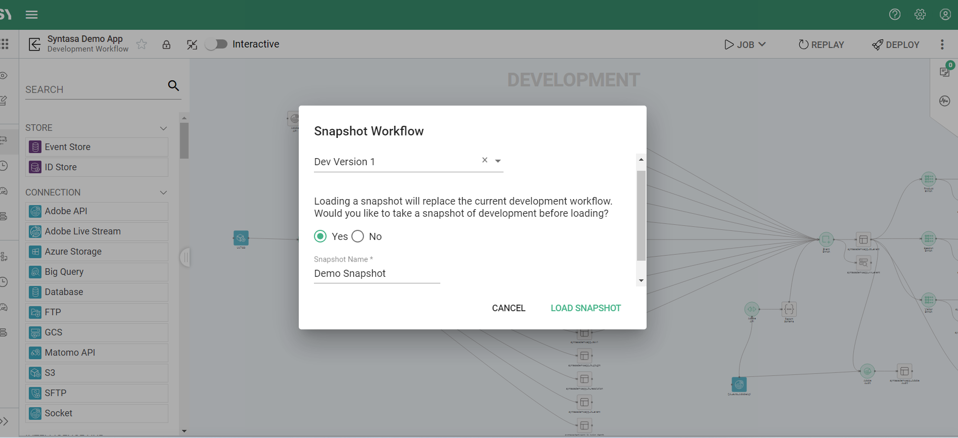 Now, you can click 'Load Snapshot'. This will load the workflow saved under snapshot 'Dev Version 1'.