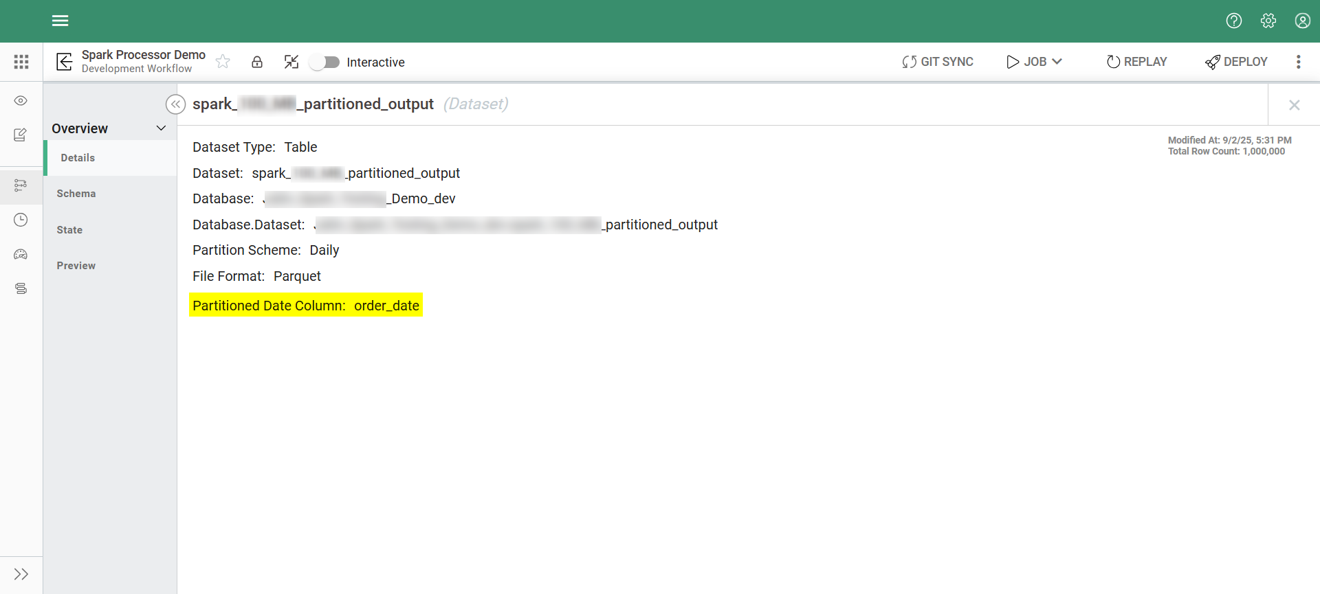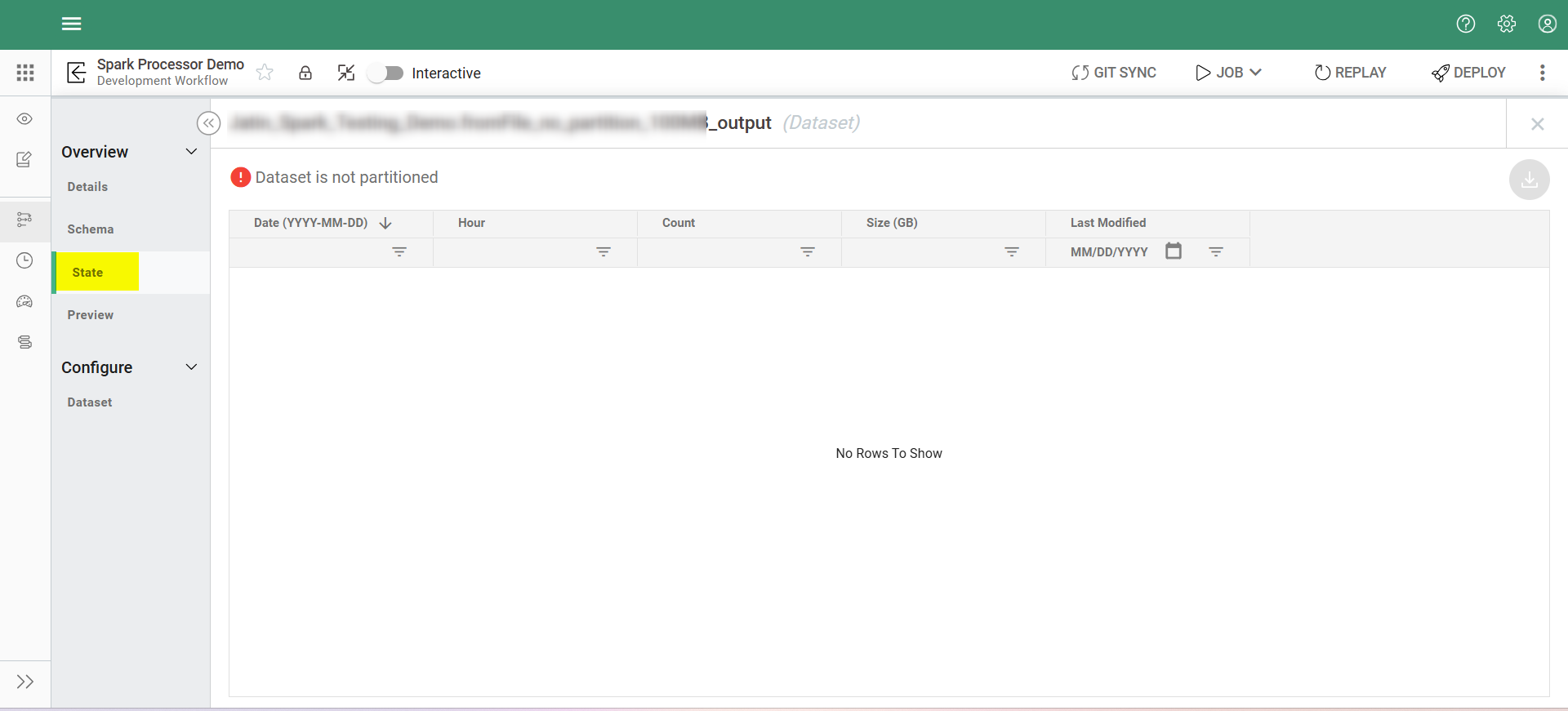 If the dataset is not partitioned—meaning the data is stored as a single table without being separated by date or other columns—the State screen will display a message at the top stating "Dataset is not partitioned", as shown in the screenshot below.