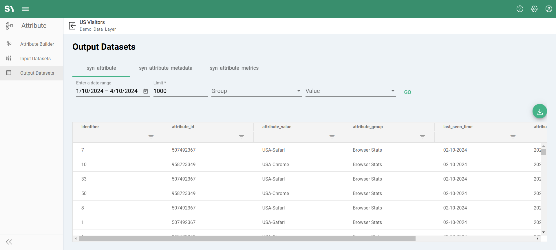 The Output Datasets screen displays the results table of the attribute generated after job execution. For more details on the output results table, see the article Attribute Results Table.