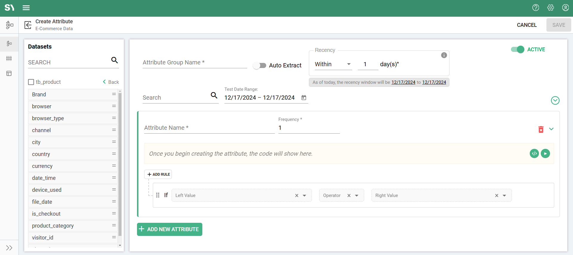 Recency defines the number of days that should be considered for the calculation of the attribute values. This field is also available when you create an attribute group using the Auto Extract feature.