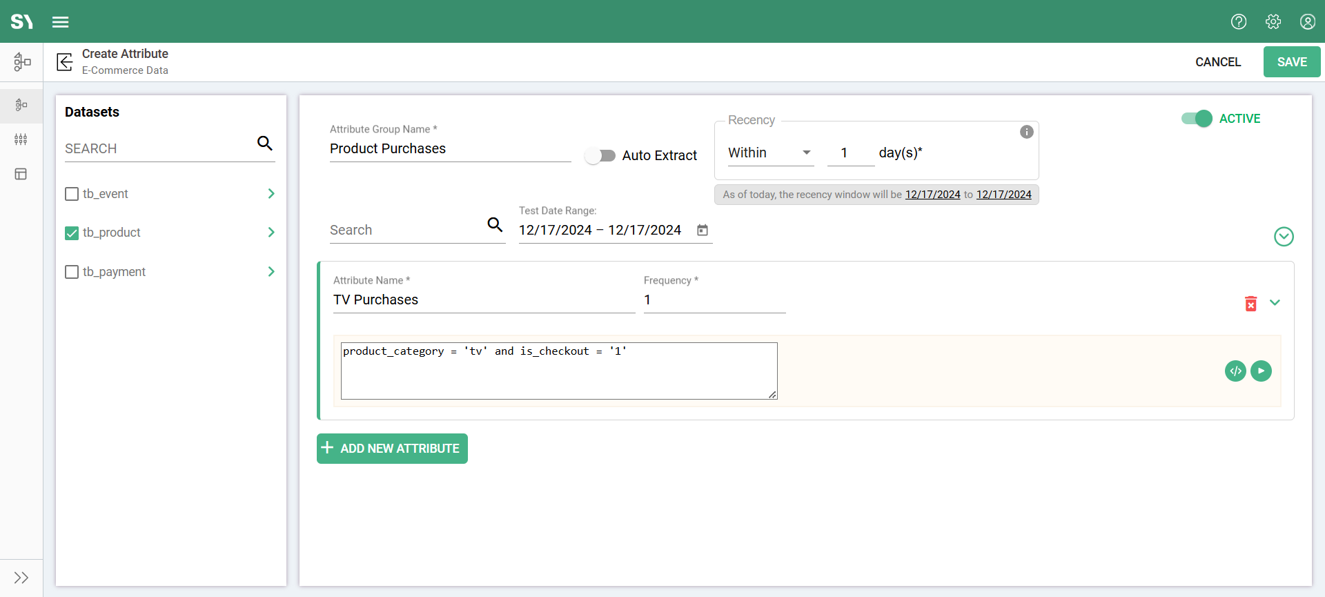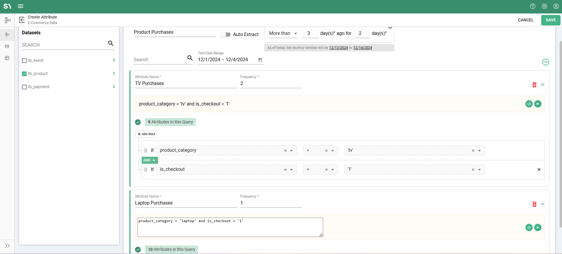 • Dataset by name tb_product is used to create an Attribute Group named Product Purchases.