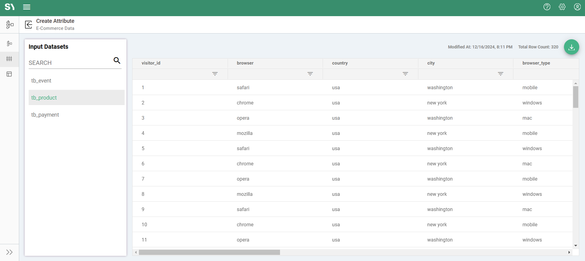 The Attribute Builder screen includes two additional screens—Input Datasets and Output Datasets—accessible from the left side menu. The Input Datasets screen provides a preview of the input data with limited records, which can serve as a reference for decision-making when creating an attribute.