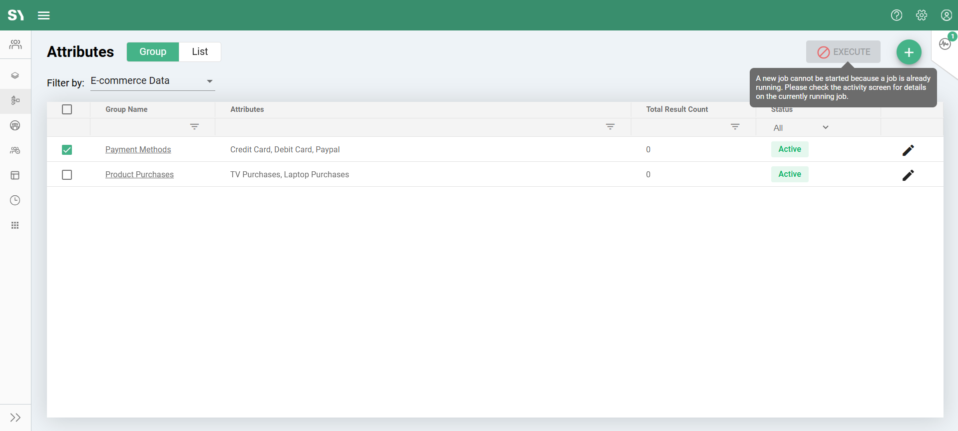 If an ad-hoc job is already running and the user selects additional attribute group(s), the 'Execute' button will be disabled, as only one job can run at a time.