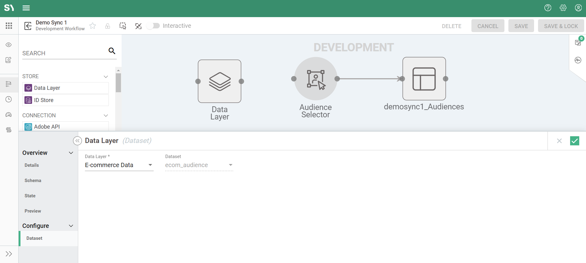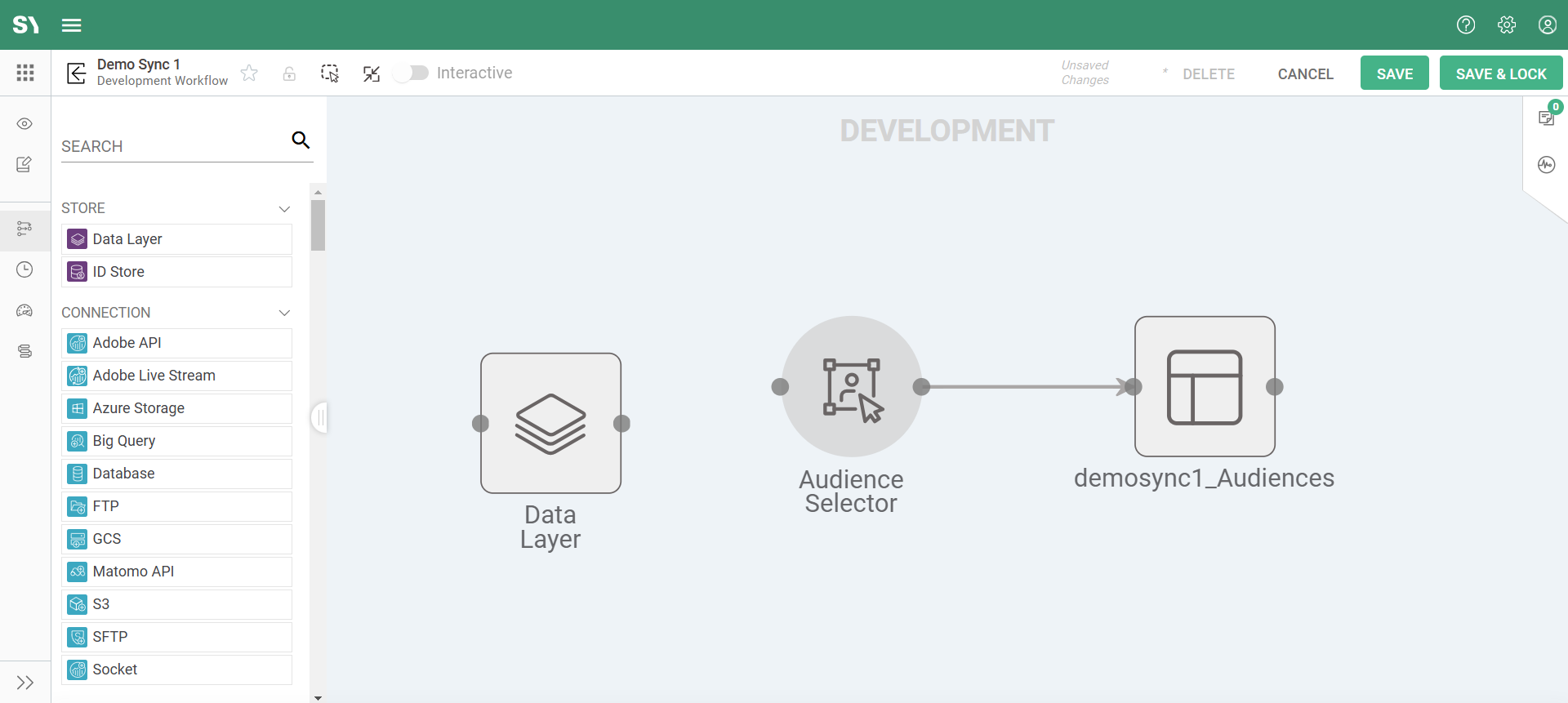 The final step for configuring the data layer is to connect it to the required Audience Selector process. To do this, drag and connect the dots between the two nodes. Once connected successfully, the color of the Audience Selector node will change. If there are multiple data layer nodes, each one should be connected to its own Audience Selector node, which you’ll need to drag onto the workflow canvas.