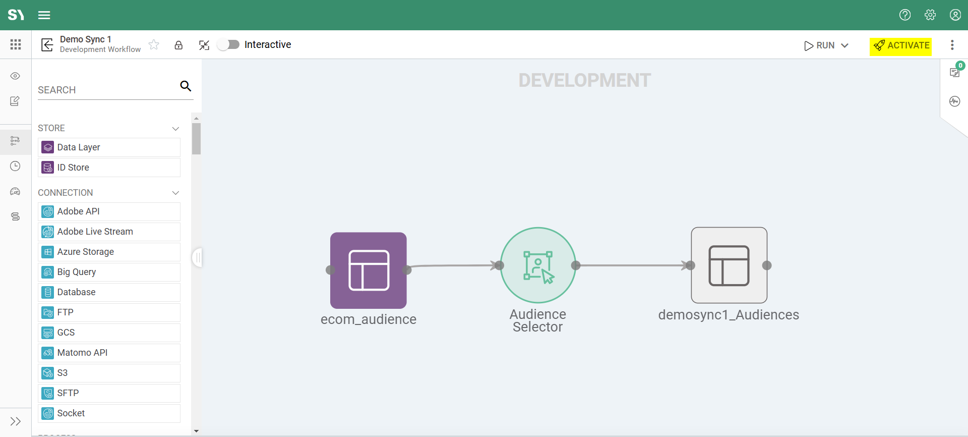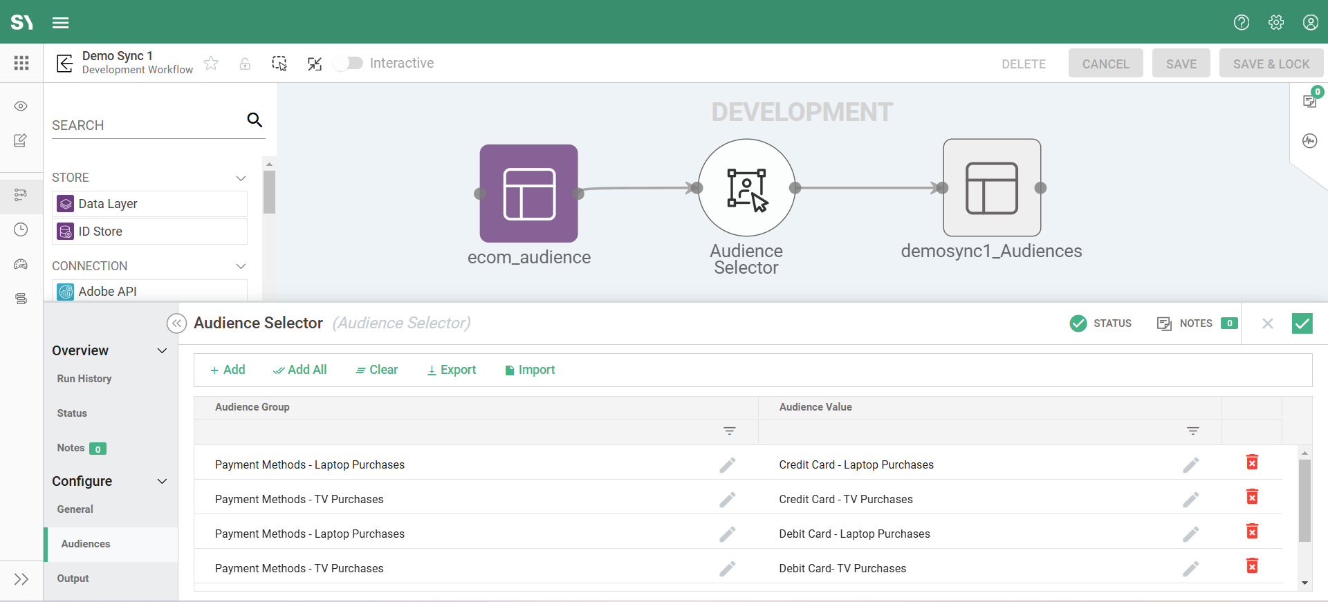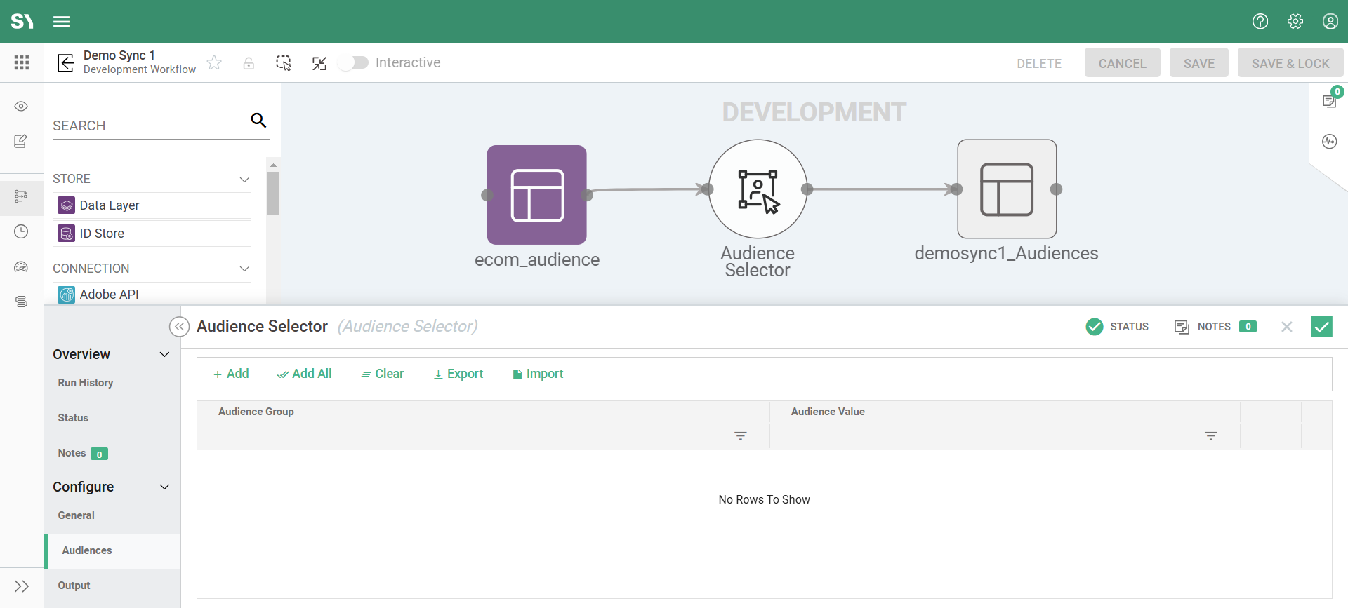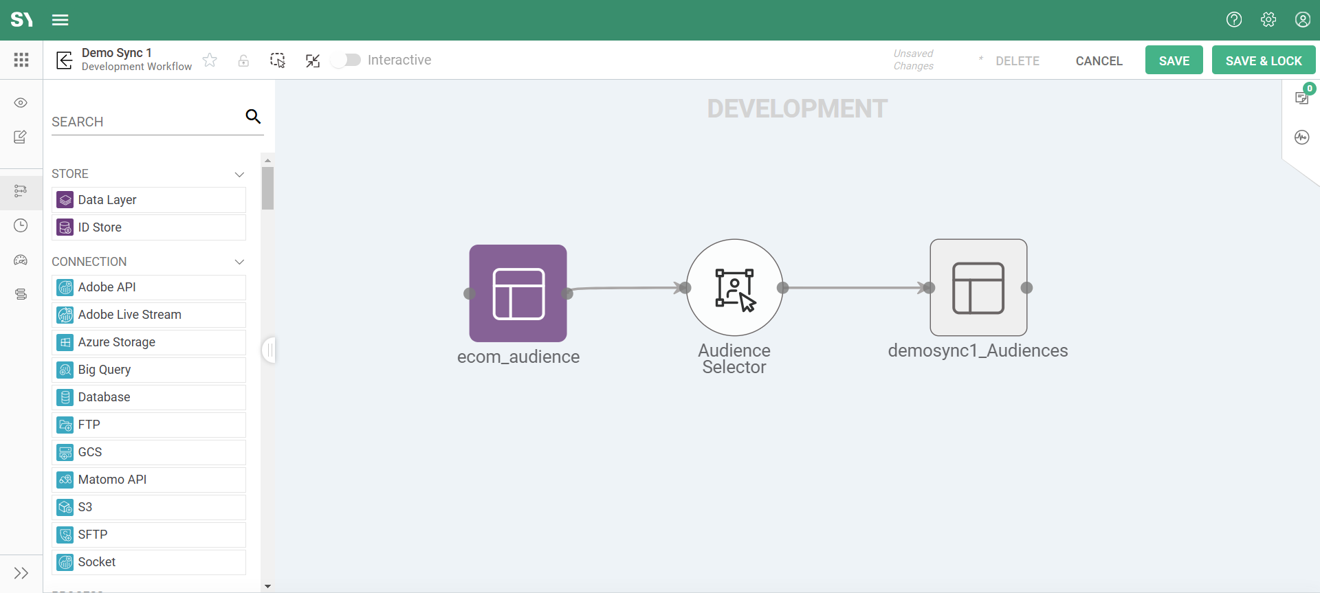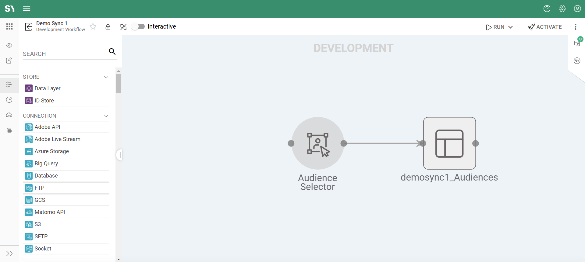 In the element selection panel on the left, you’ll see that an Audience Sync app offers various stores and processes that can be added. However, users need to focus only on these key elements: one type of input store, the data layer, and one type of process, the audience selector.