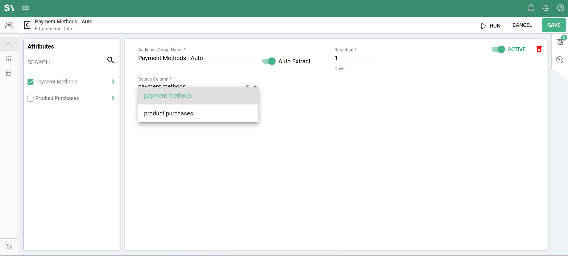 • Attribute Group - Select the column of the connected attribute group from where the audience values are to be extracted. In the screenshot below, we are trying to extract all the unique payment methods used from the attribute group Payment Methods.