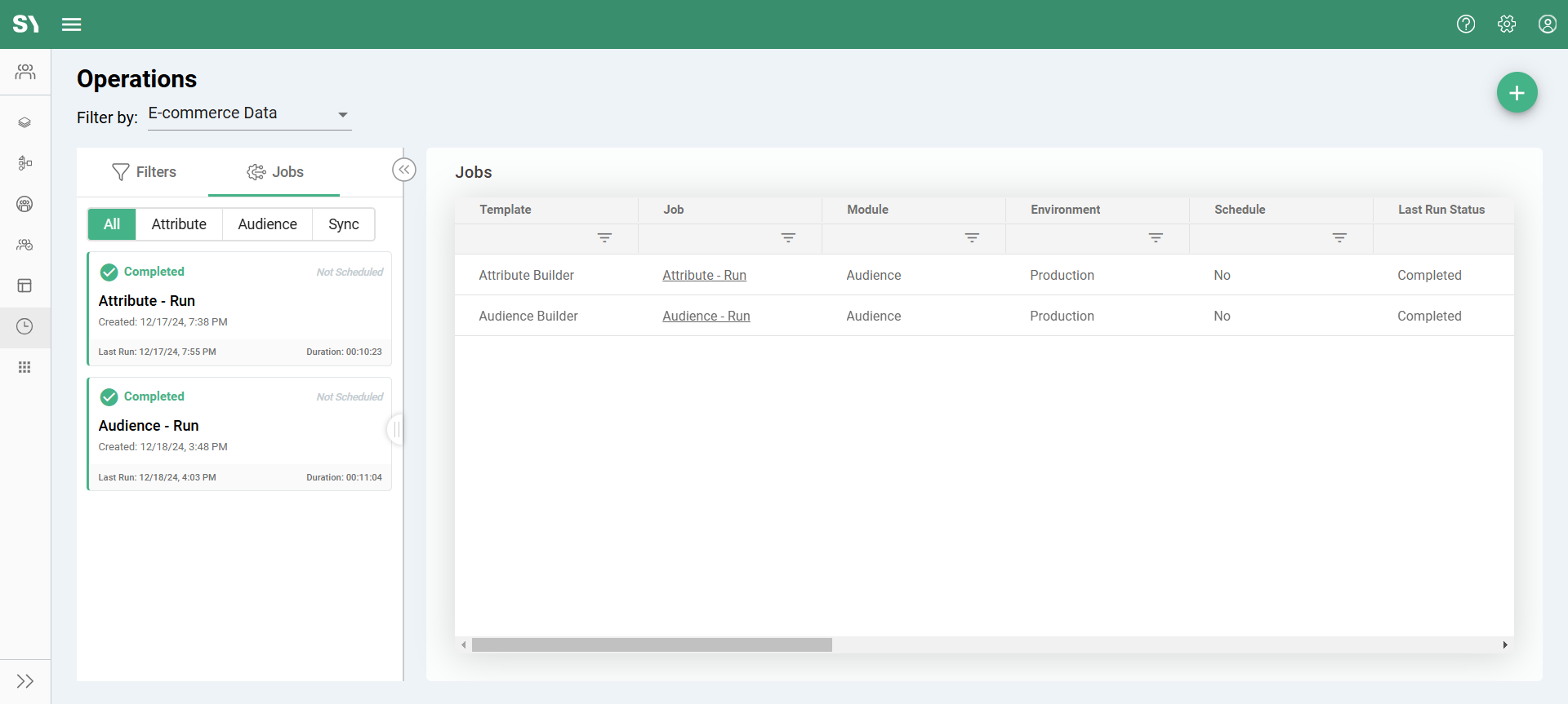 The Operations screen provides a comprehensive view of all job activities within the selected data layer. It enables users to create and schedule jobs for attributes, audiences, and sync apps. Additionally, users can easily track job activities, review historical job executions, and configure existing sync jobs.