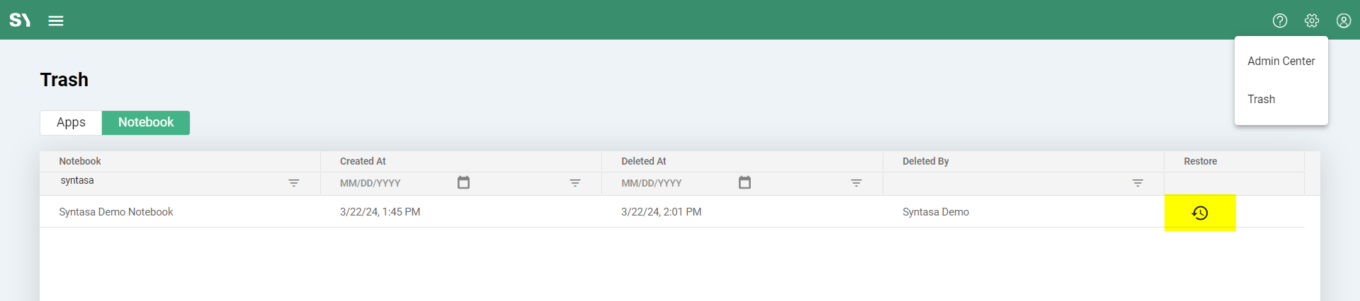 If you accidentally delete a notebook, you have the option to restore it from the Trash screen. Follow these steps to restore the deleted notebook: