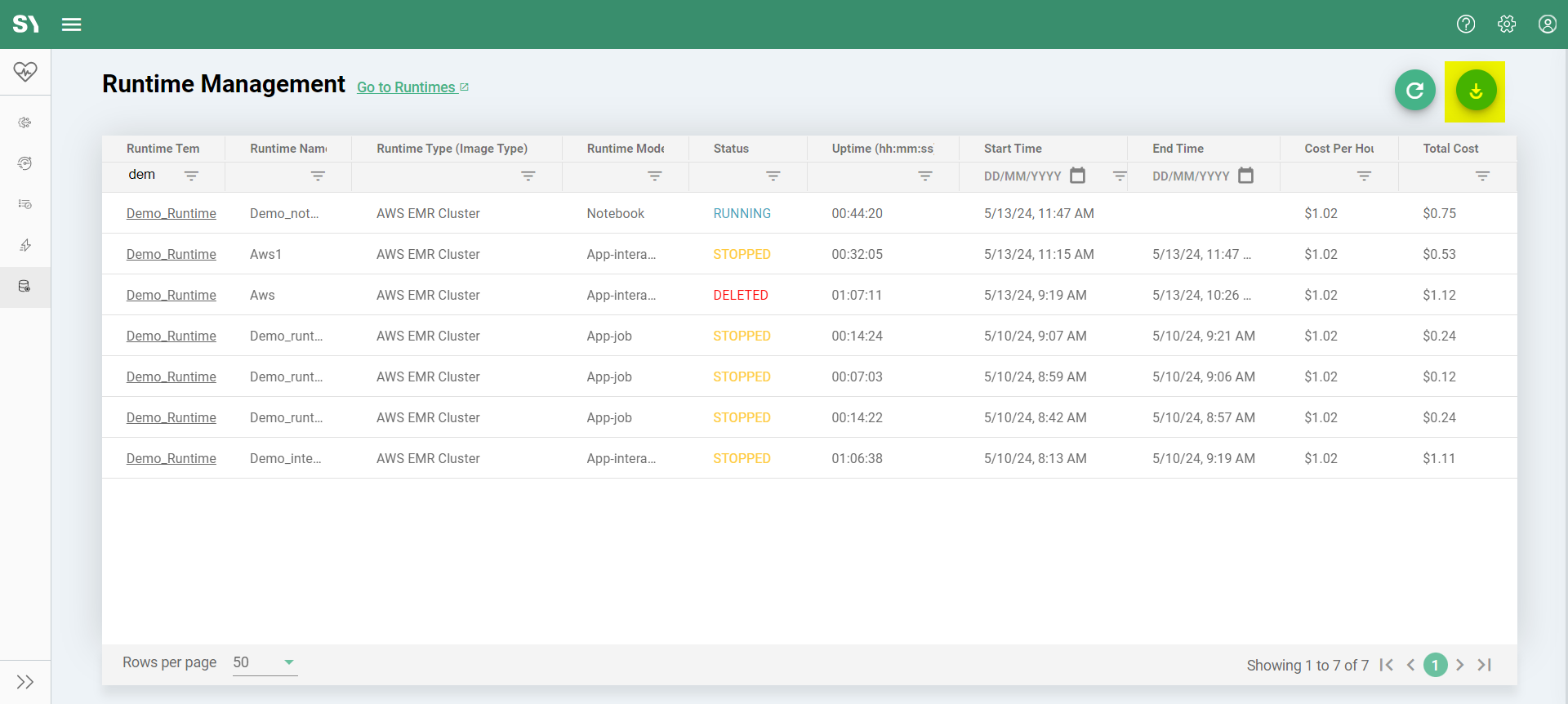 At the top right corner of the screen, you'll find a button to export the complete runtime insights displayed in the table. While Syntasa enables filtering of table data using each column filter, there are scenarios where advanced filtering and total cost calculation may be necessary. Exporting the data to a CSV file proves invaluable in such cases. Here's how to do it: