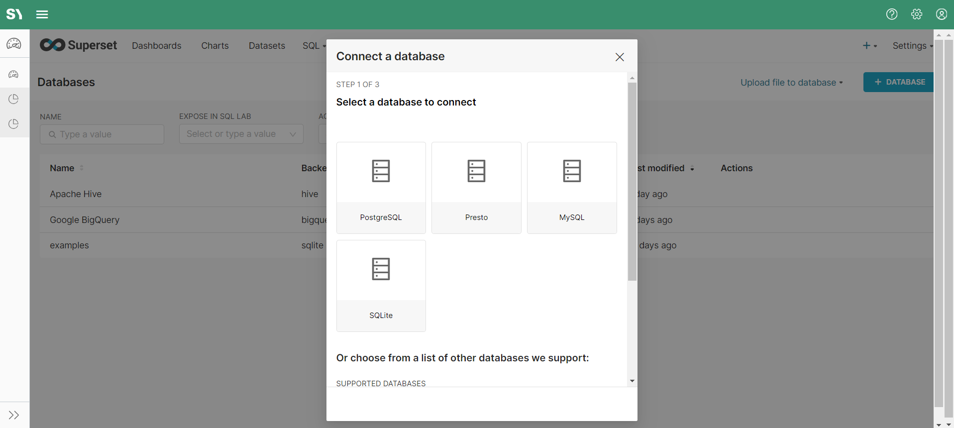 Syntasa, using Superset, supports a variety of databases. You can find the complete list of supported databases in this official blog of Superset.