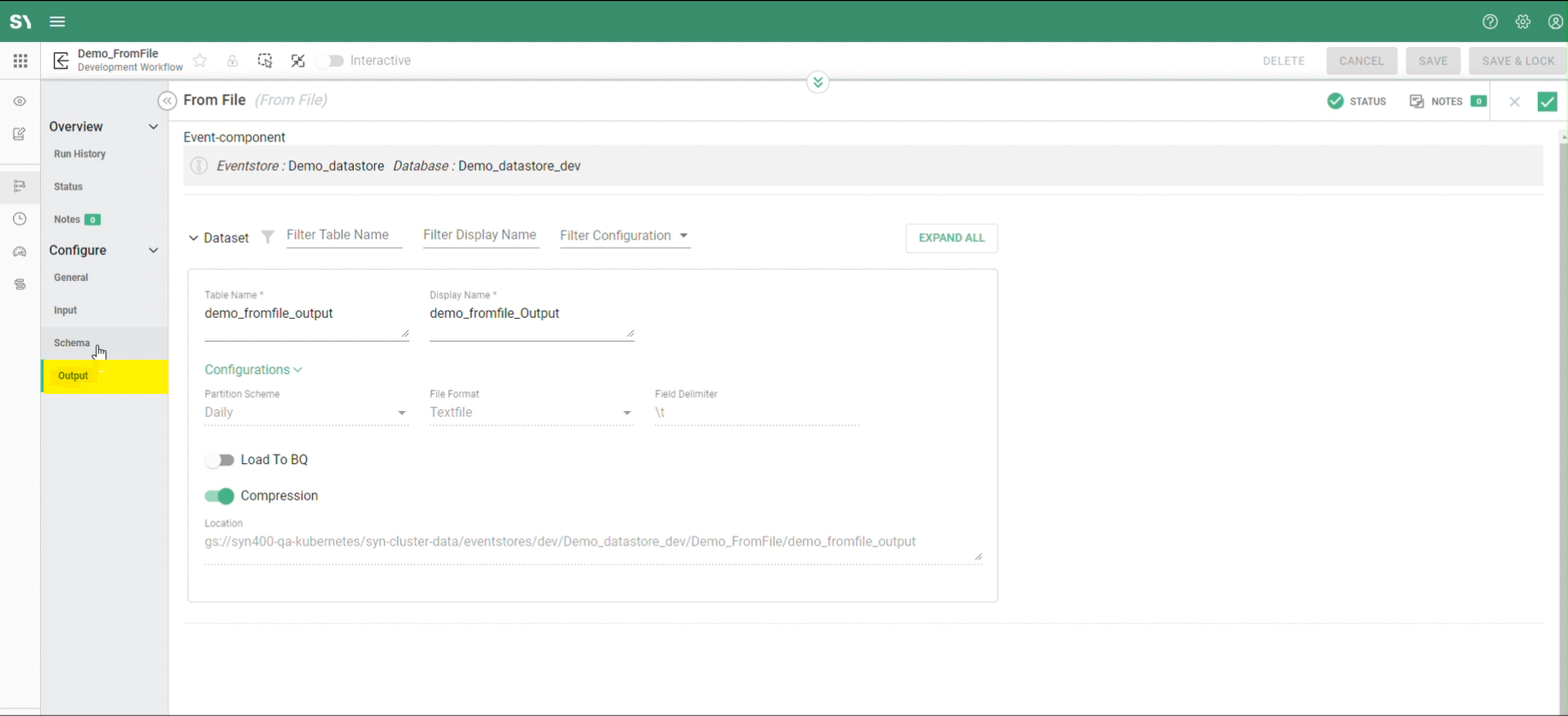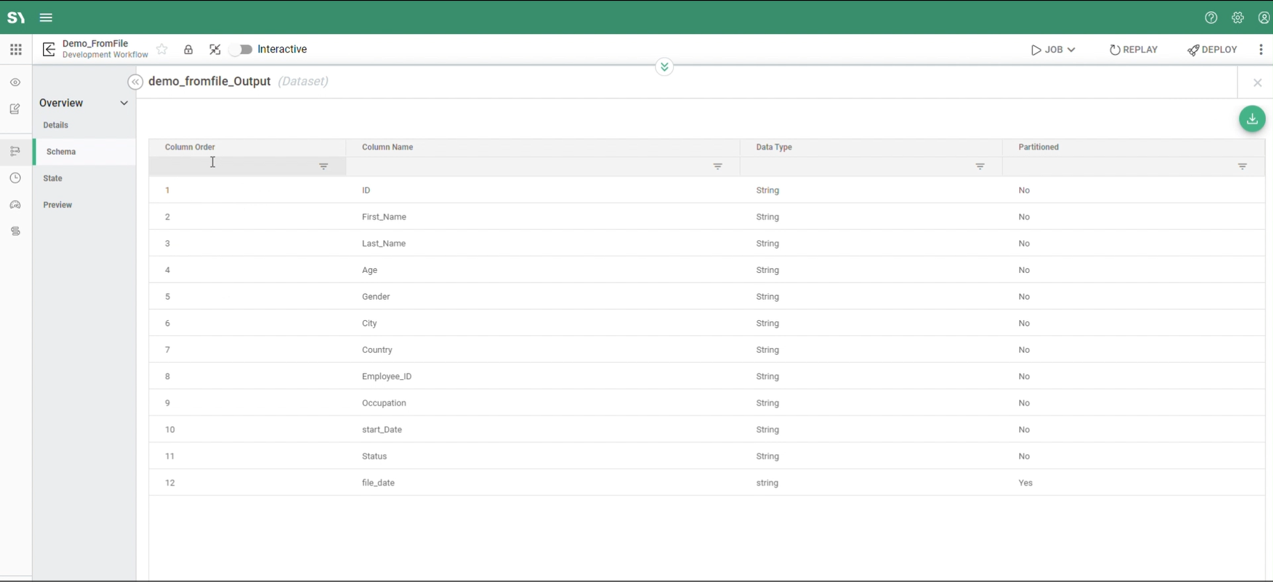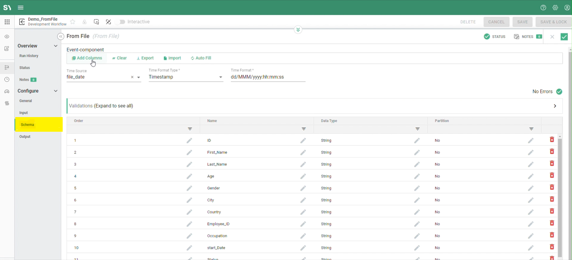 Defining Partition Columns: The schema section allows you to configure details related to partitioning your data. By default, SYNTASA might use a field named "file_date" as the partition column. Partitioning helps organize your data based on specific criteria for easier retrieval and analysis.