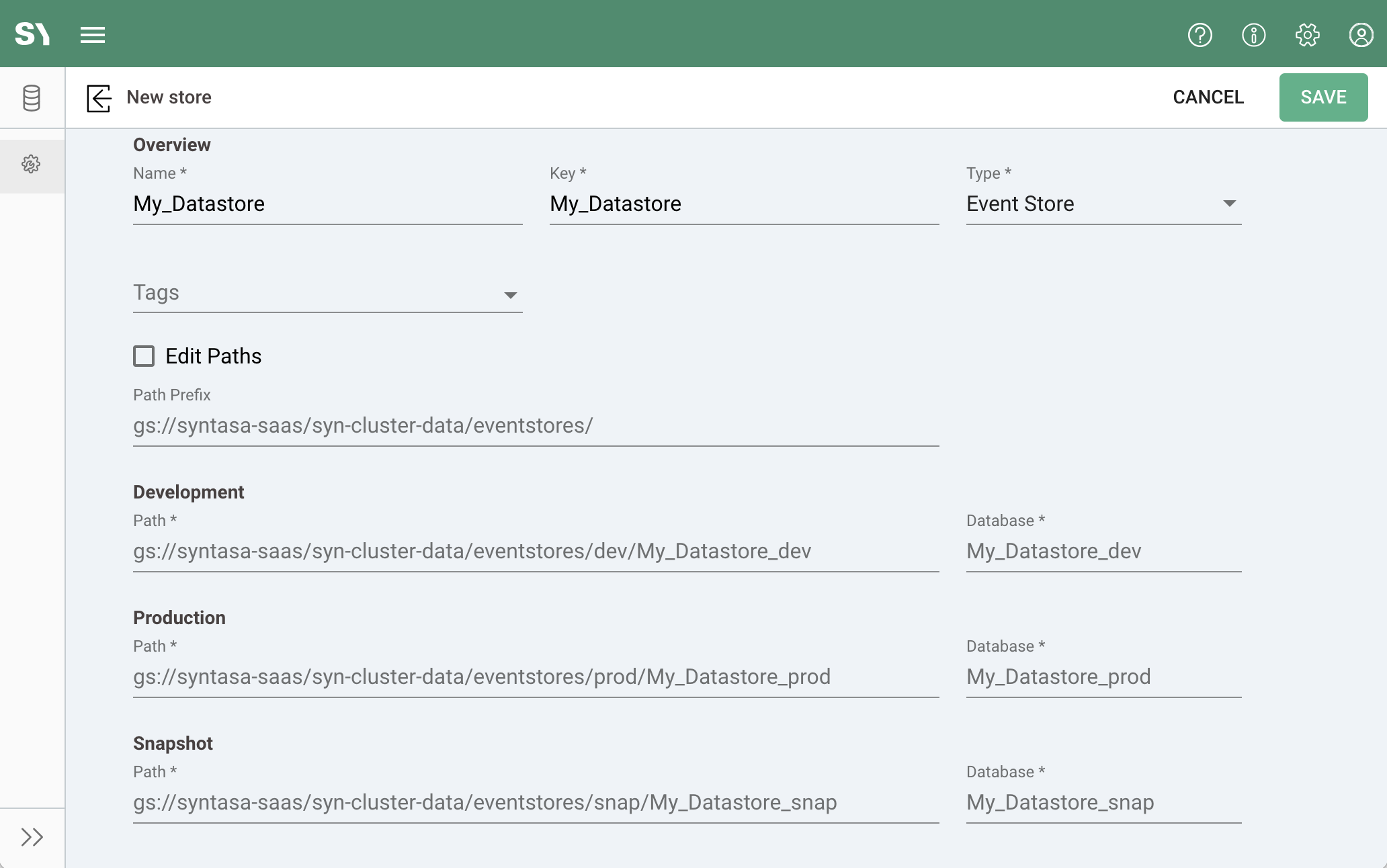 Creating a datastore, i.e., event stores and ID stores, in the Syntasa application has been considerably eased by prefilling most fields. Previously, the various path fields needed to be manually filled by the user, but the proper or conventional values were in question.