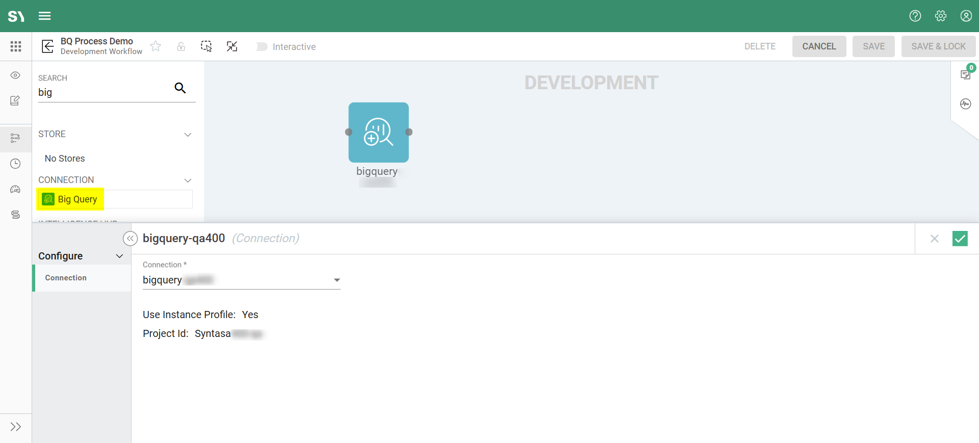 When you connect the BQ Process to a BQ Connection, you only need to mention the dataset and table name in your SQL query — the project name is not required because it is already configured in the connection setup.