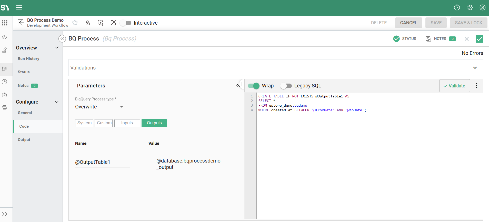 - Code – The main screen where you define your BigQuery SQL for data transformation. This section also supports dynamic parameters (such as @InputTable1) to make the code reusable and environment-independent.