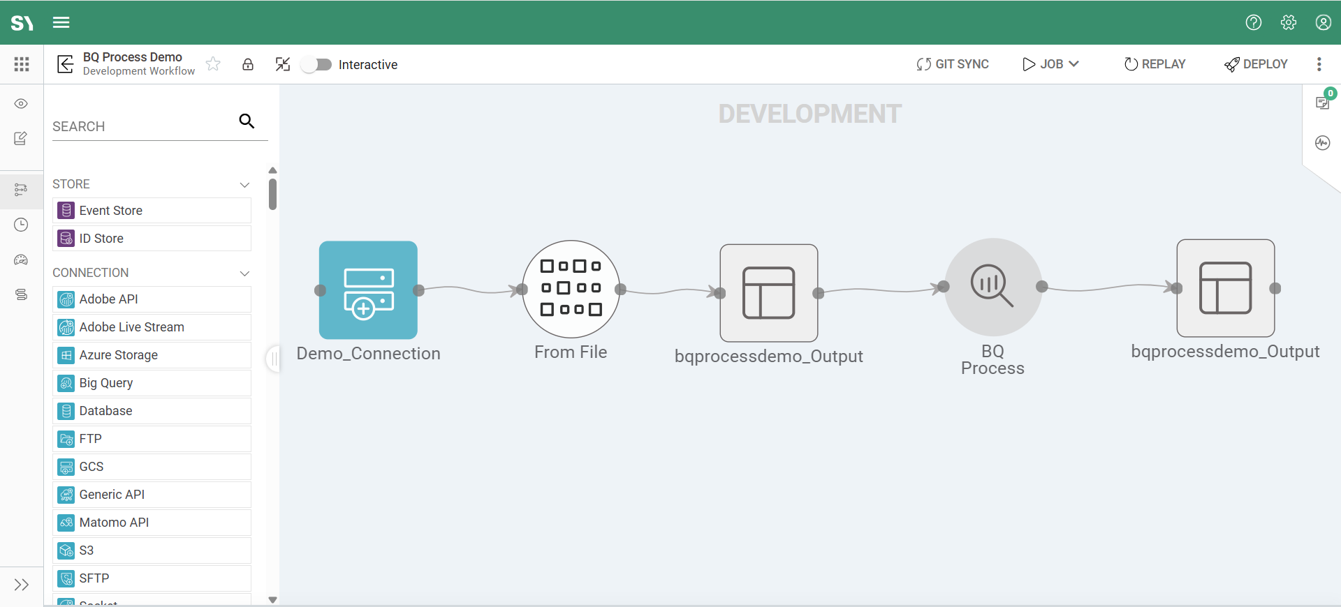 Once the input connection is configured, the next step is to add and set up the BQ Process. Drag and drop the BQ Process component onto the canvas, link it with the input connection, and define the SQL logic that will process and transform the data.