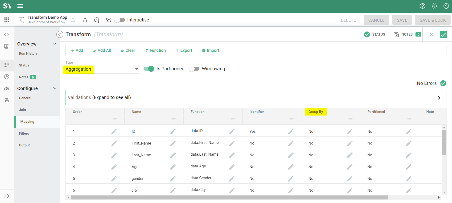 - Aggregation: When aggregation is selected, a "Group By" column will be made available for use