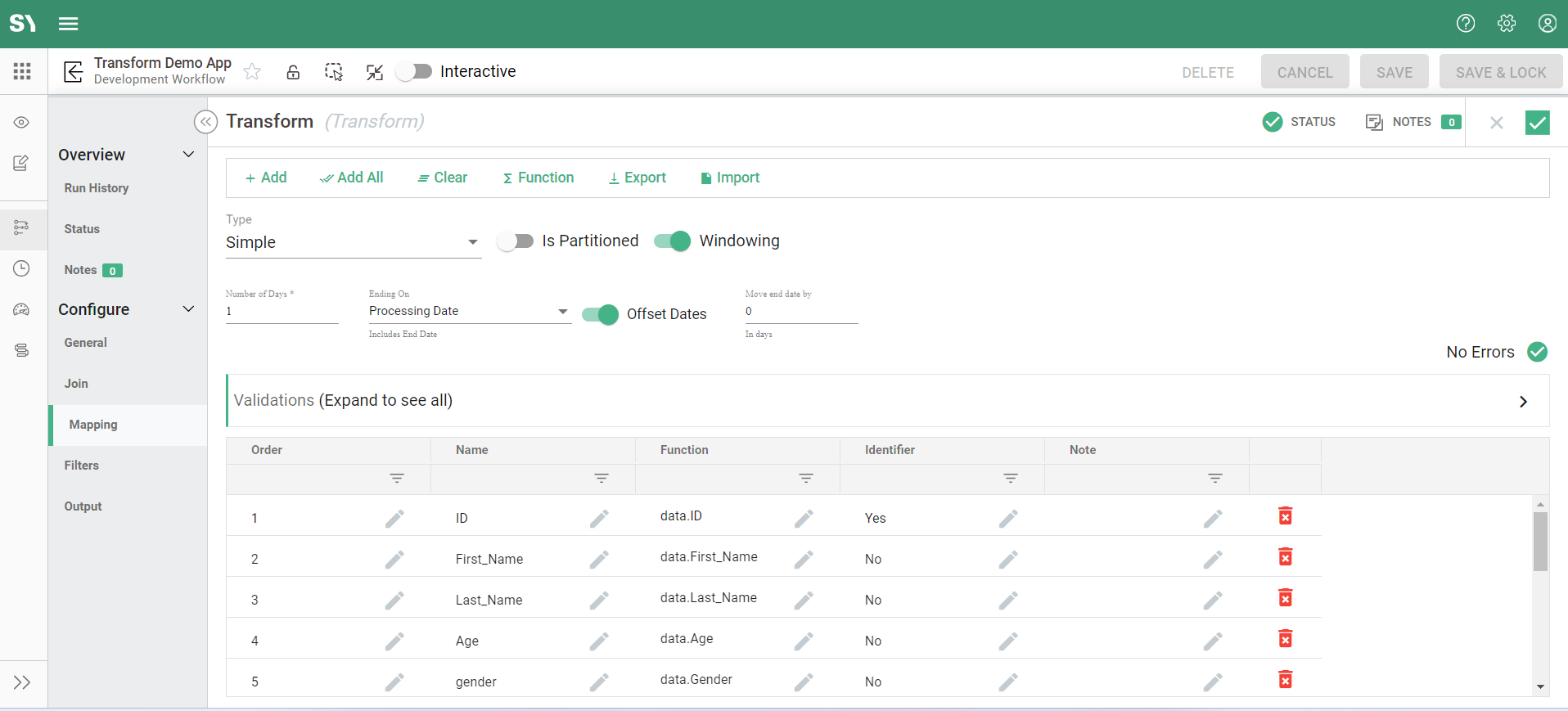 The Mapping screen is where event data fields are mapped to Syntasa fields, desired functions are applied, and user-friendly labels are created.