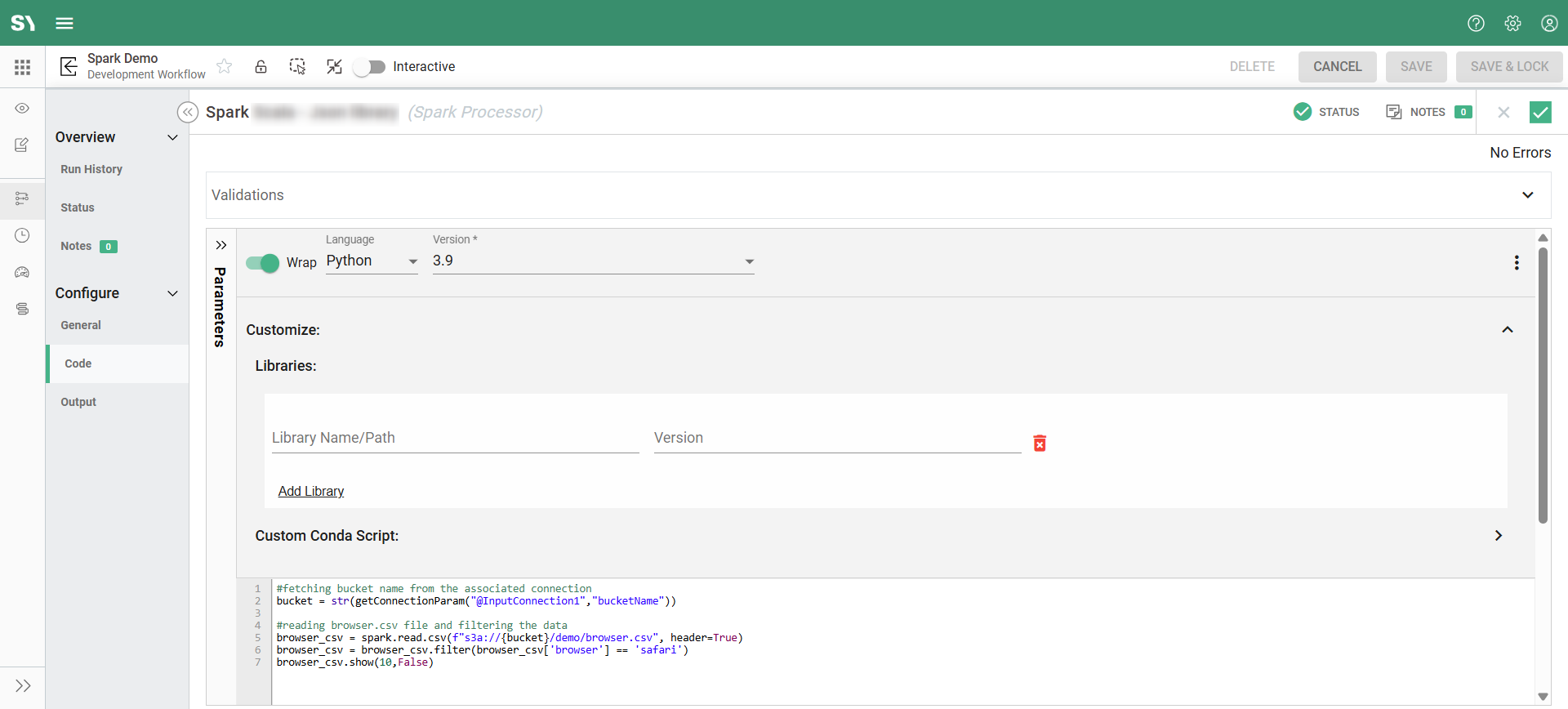 - Python Version Selection: You can choose a specific Python version (e.g., 3.9, 3.10, 3.11) for your Spark Processor. Each processor can operate with a different Python version independent of the runtime.