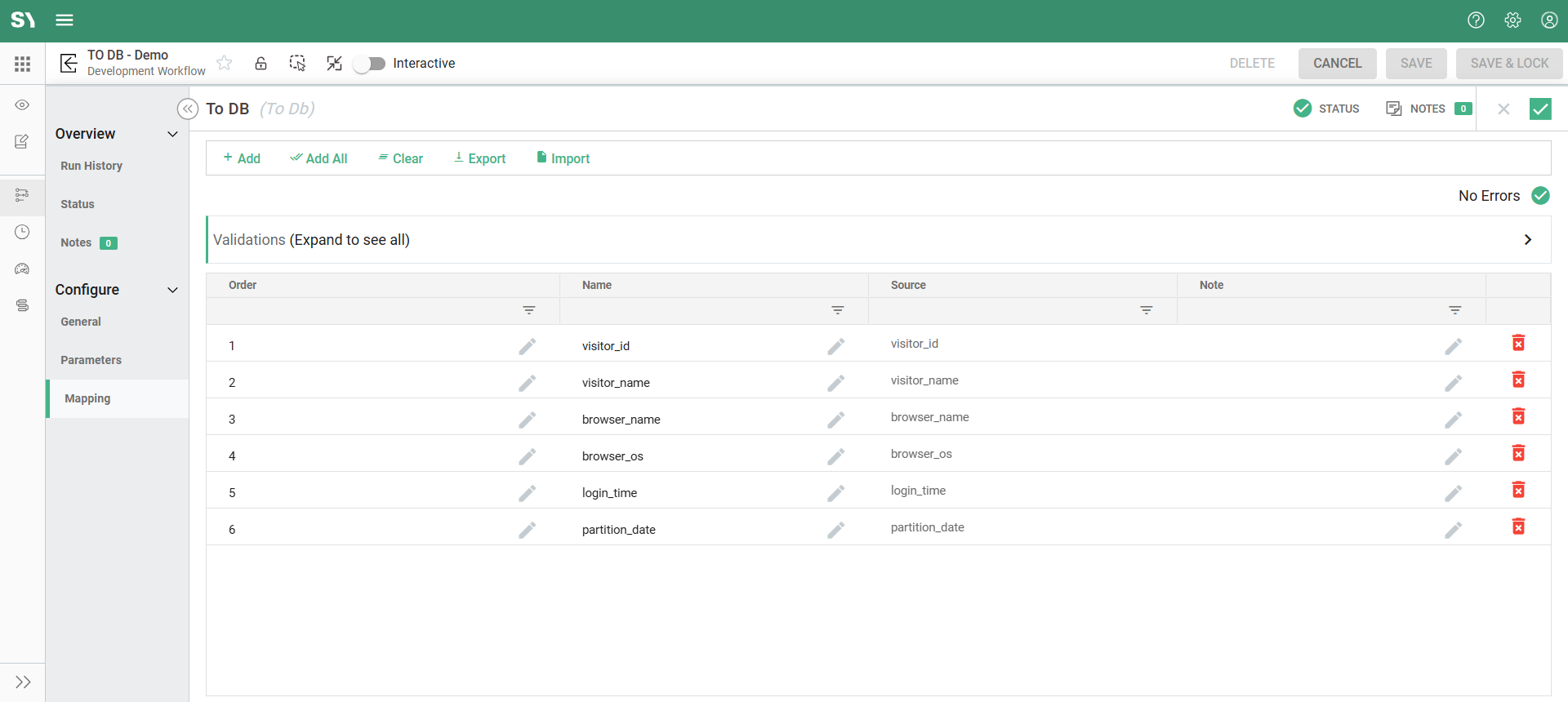 The Mapping screen in the TO DB process allows users to control which columns are exported to the target database and how they appear. This configuration is essential for aligning your output with the structure, naming conventions, and requirements of the destination database table.