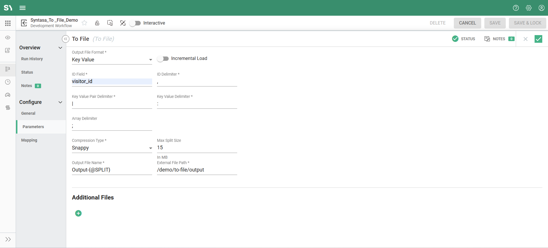 The Key-Value output format in the TO FILE process allows you to export your structured data into a flat text format where each row contains key-value pairs. Syntasa’s TO FILE process gives users complete control over how output data is formatted by allowing custom delimiter values in Key-Value output files. Rather than being restricted to specific characters, users can define their own ID Delimiter, Key-Value Pair Delimiter, Key-Value Delimiter, and Array Delimiter based on the needs of their downstream systems. For example, you may choose a comma, pipe (|), colon (:), tab (\t), or any other character. This flexibility allows you to generate output files in formats compatible with legacy systems, APIs, flat-file ingestions, or any third-party tools expecting a specific structure.