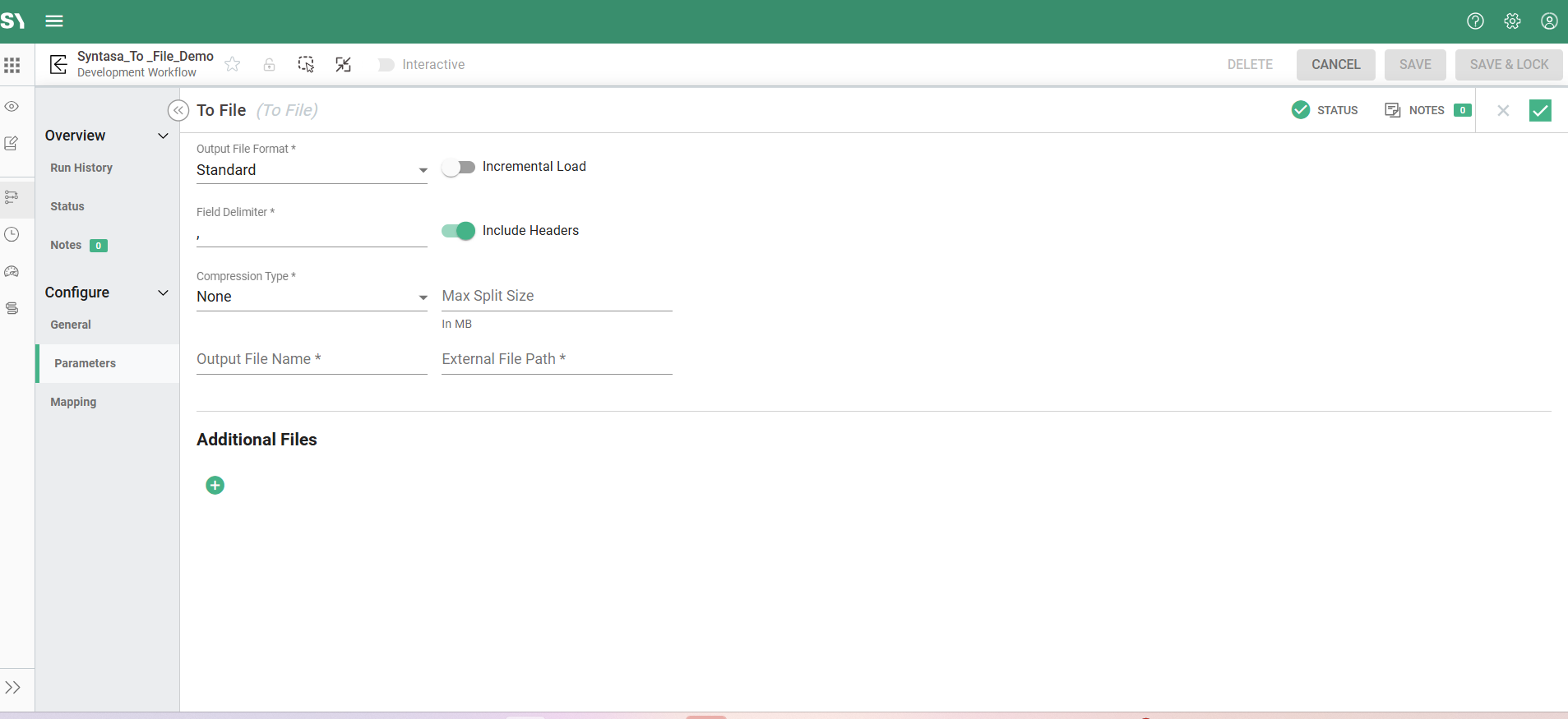 he To File process in Syntasa allows you to export processed data from the platform into external file formats like CSV or text files. When choosing the Standard output format, the system creates a comma-separated (CSV-style) file that is easy to share, analyze, or integrate with external tools. This article will guide you step-by-step through the configuration options for generating a Standard output file, including an explanation of each setting visible in the Parameters section of the TO FILE process.
