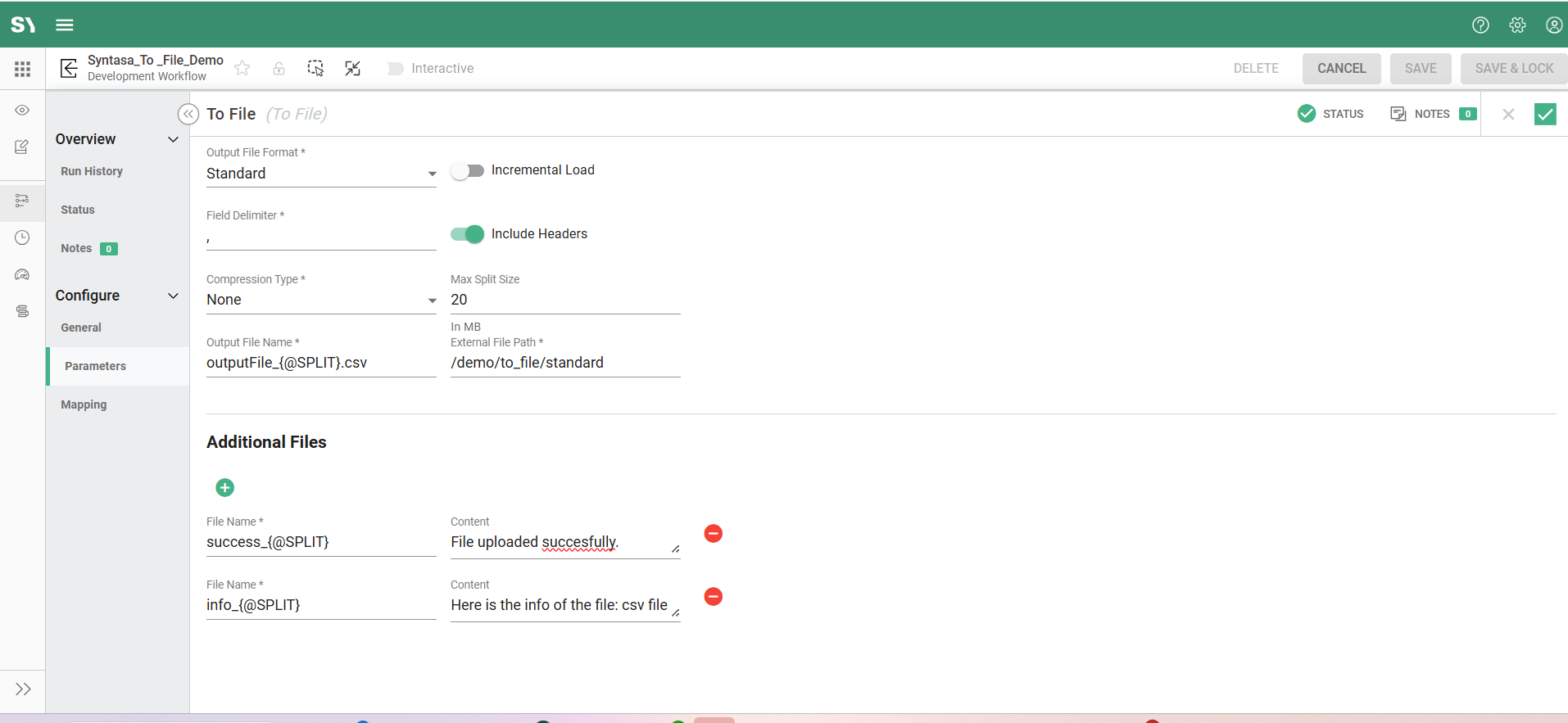 If you use the {@SPLIT\} parameter in the names of your additional files, Syntasa will create a unique version of each additional file for each primary file. For example, suppose your primary output is split into two files: output_1.csv and output_2.csv. If you define two additional files as success_{@SPLIT}.txt and info_{@SPLIT}.txt, the system will generate: